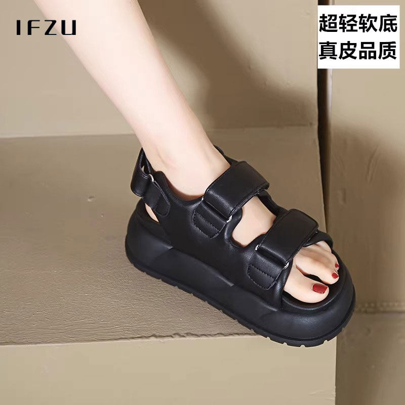 Genuine Leather Thick-Soled Sports Sandals for Women, Summer 2026 New Fashion, Height-Increasing Soft-Soled Velcro Casual Beach Shoes