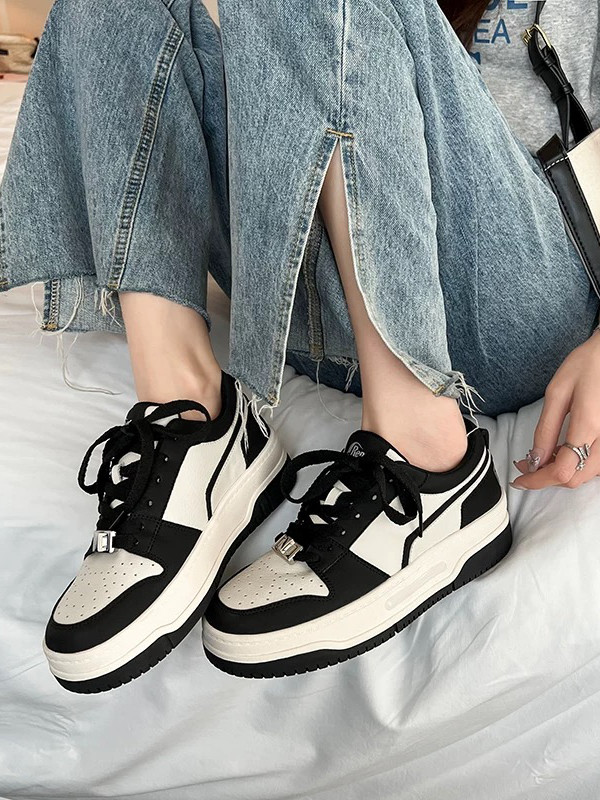 Hong Kong Versatile Skateboard Shoes for Women 2026 Spring and Autumn Trendy Internet Celebrity White Thick-Soled Black and White Panda Shoes Genuine Leather Sneakers