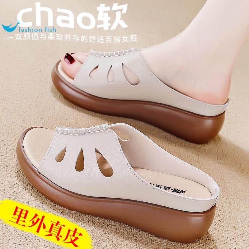 Genuine Leather Soft-Soled Sandals for Women, 2026 Summer New Style, Middle-Aged Women's Non-Slip Rubber Sole Clogs for Outdoor Wear
