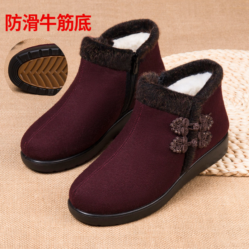 Old Beijing Cloth Shoes for Women, Winter Fleece-Lined Warm Wool Shoes for Mothers, Elderly Cotton Shoes, Non-Slip Rubber Sole Shoes for Old Ladies and Grandmothers