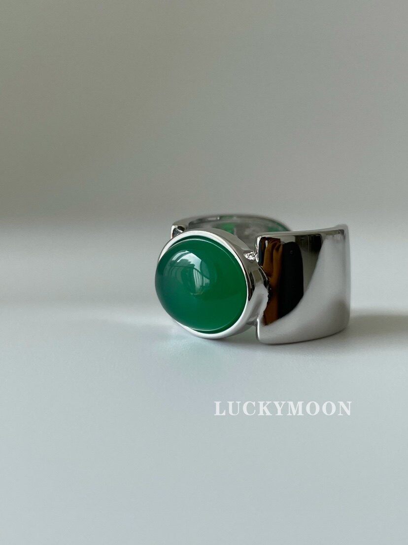 Luckymoon Jewelry-Like Natural Green Chalcedony Wide Ring S925 All-Over Sterling Silver R199