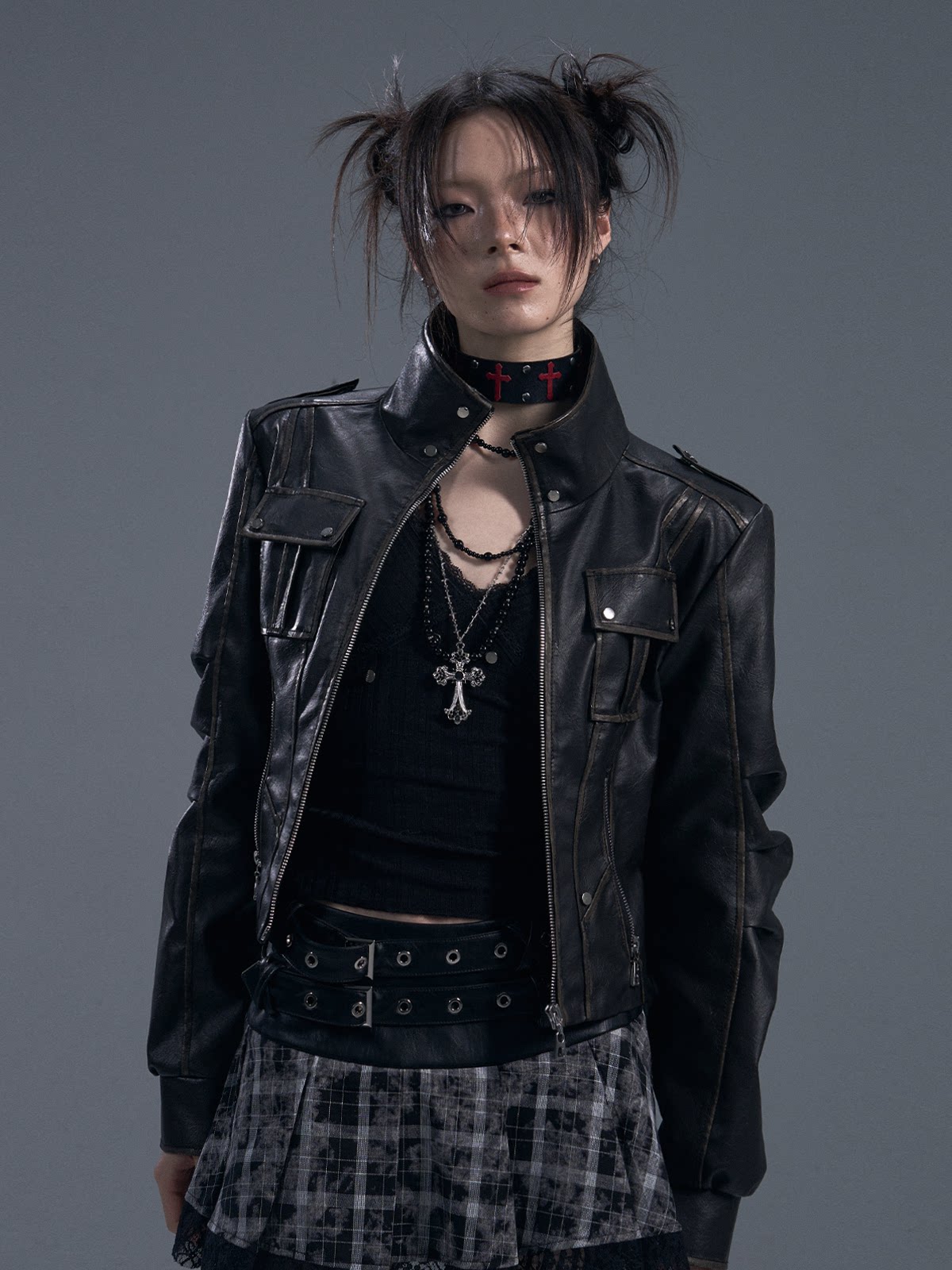 Lost after Garden Retro Punk Rebellious Heavy-Duty Distressed Slim-Fit Short Silhouette Biker Leather Jacket