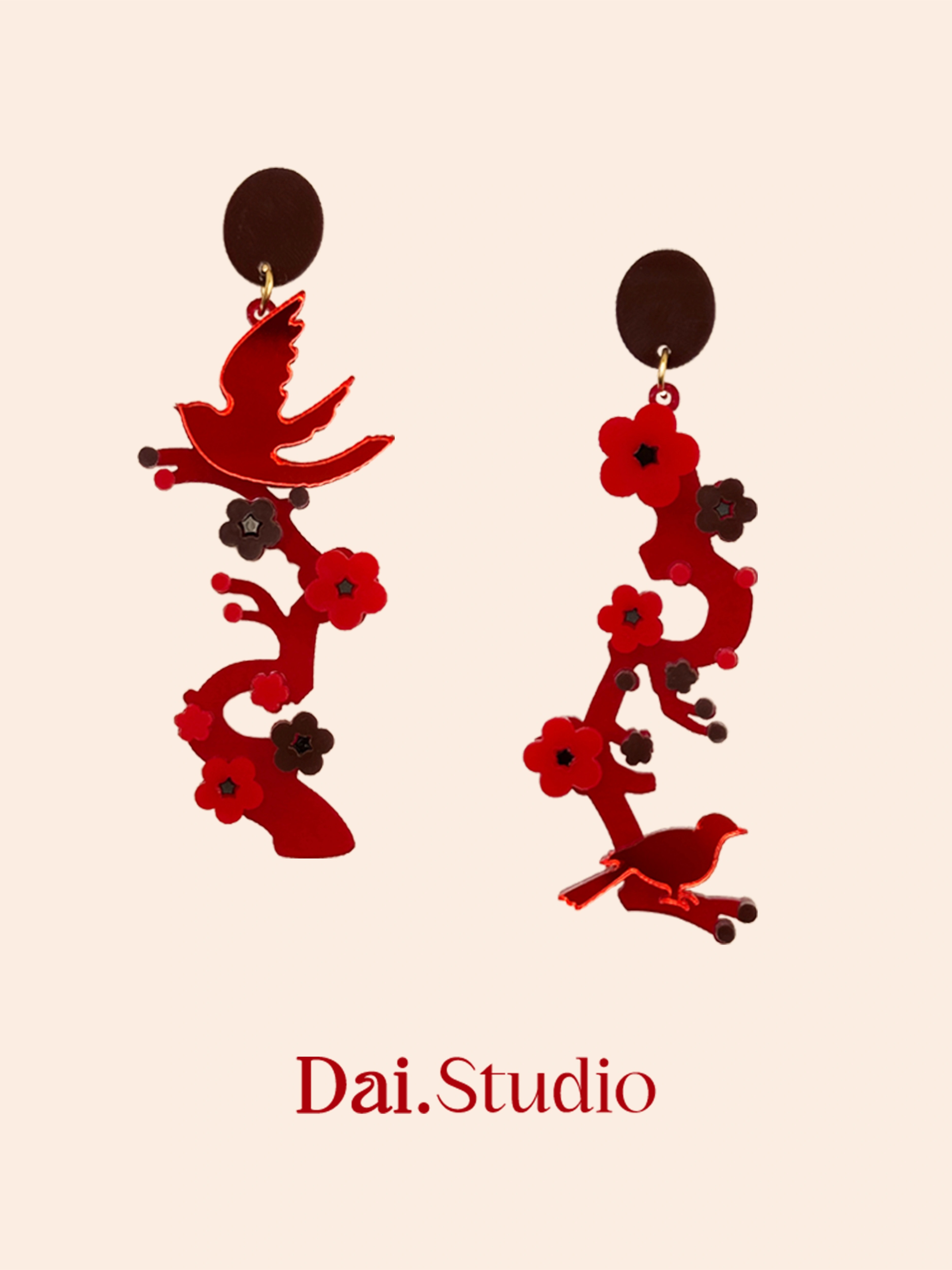 Dai Group X Sewing Buttons Illustrator Collaboration Model'Joy on the Plum Branch' New Year Earrings Oriental Three-Color Earrings