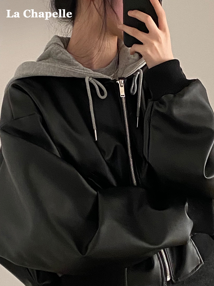 La Chapelle Official Zippered Double-Pocket Casual Loose Faux Two-Piece Hooded Leather Jacket for Women, Autumn and Winter Leather Jacket