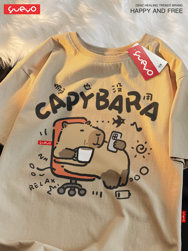 Yueyou Capibara Funny Working Capybara Calm Outfit Cute Summer Pure Cotton Drop Shoulder Short Sleeve T-Shirt for Men