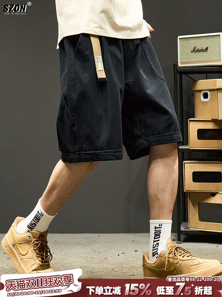 Japanese-Style Work Shorts for Men, Summer Loose Fit, Pure Cotton, Casual Straight-Leg, Thin Five-Point Shorts, Simple Trendy Black Mid-Length Pants