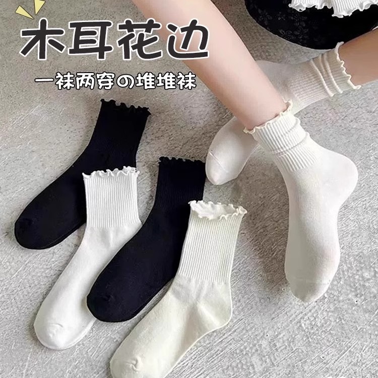 Ruffled Socks for Women, Mid-Calf, Spring and Autumn, British Style, Paired with Loafers, Mary Janes, White Socks