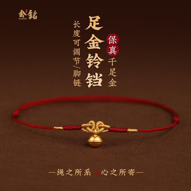 999 Pure Gold Bell Red Rope Anklet for Women Gold Braided Ultra-Fine Simple Animal Year Male Safe Pure Gold Anklet