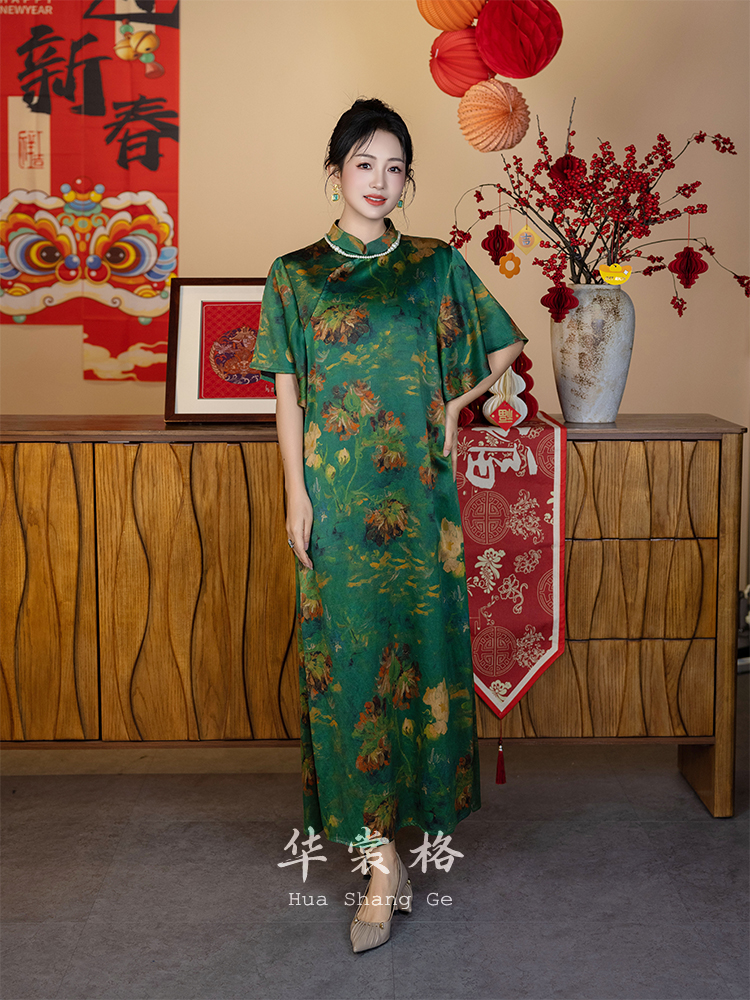 Chinese-Style Green Oil Painting Dress with Stand Collar, Diagonal Placket, Short Sleeves, Heavy Silk Cloud Fabric, Hs472