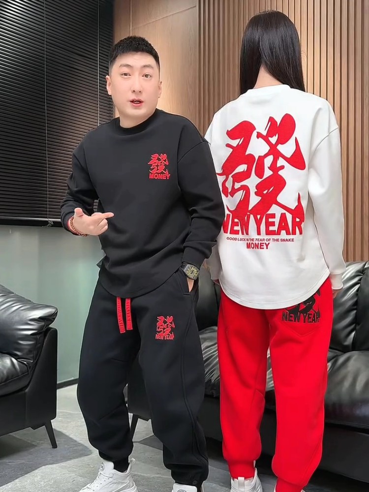 2025 Autumn and Winter Fleece-Lined Thickened Sweatshirt Fashion Set for Men, Chinese Style Embroidered Prosperity Red Clothing and Pants for Men