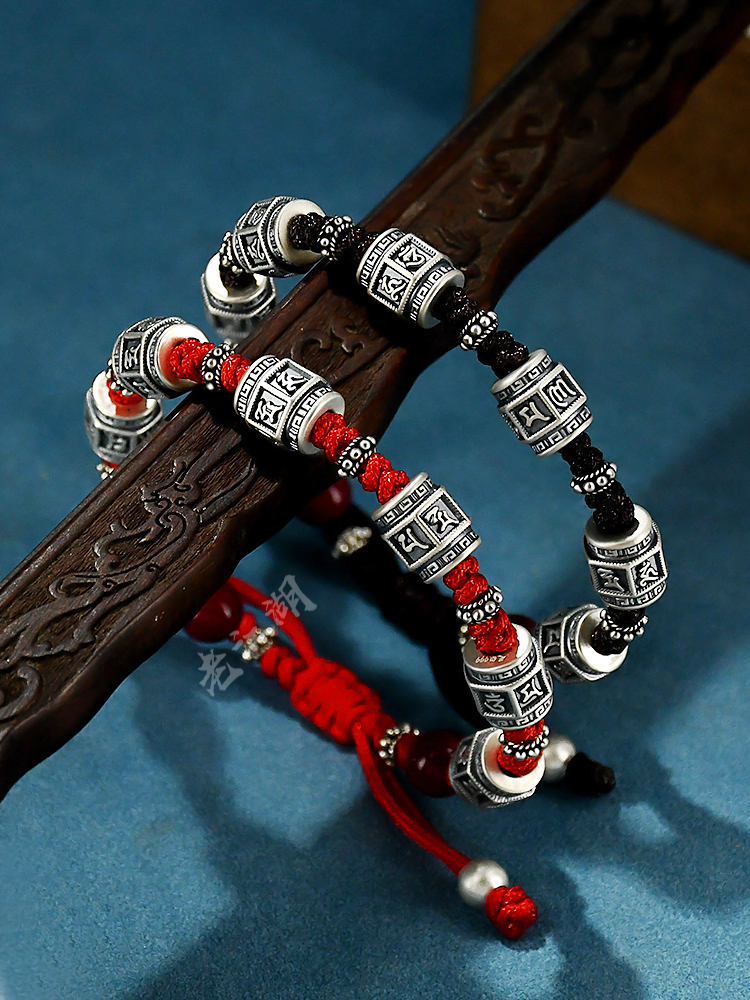 999 Pure Silver Six-Character Mantra Bracelet for Men and Women, Ancient French Style Woven Bracelet with 7 Pure Silver Mantra Beads for Good Luck