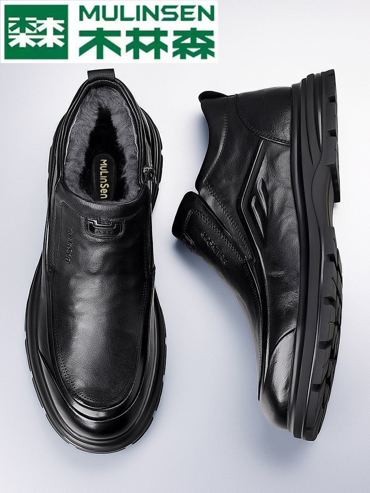 Mulinsen Men's Winter Cotton Shoes with Plush Lining, Warm Leather Shoes for Men, Thick Wool Soft Sole Slip-On Shoes, Northeastern Large Cotton Shoes