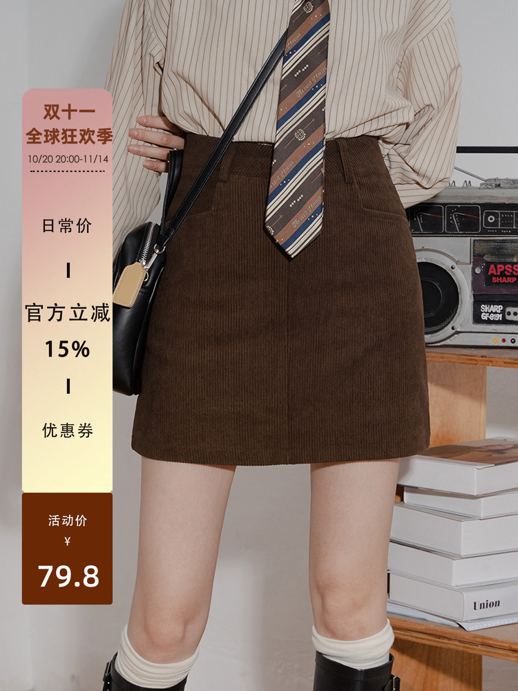 Retro High-Waisted Corduroy A-Line Short Skirt for Women in Autum with Anti-Exposure Lining, Simple and Versatile Corduroy Hip-Hugging Skirt