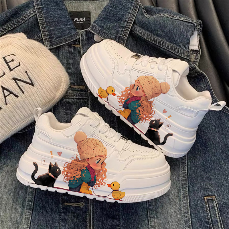 Genuine Leather Thick-Soled White Sneakers for Women, Little Yellow Duck Collaboration, New Versatile Height-Increasing Casual Sneakers for Petite Individuals