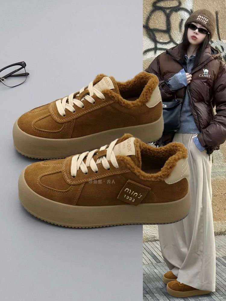 Sanli Korean Style Genuine Leather Lamb Wool German Training Shoes for Women 2025 Spring and Autumn New Round Toe Fleece-Lined Warm Thick-Soled Casual Shoes
