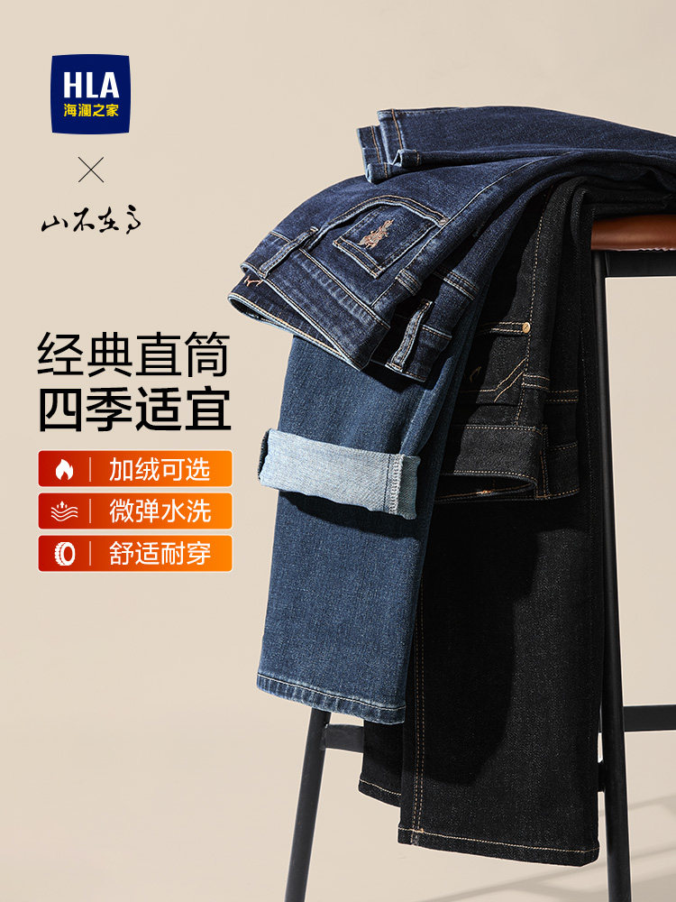 Hla/Heilan House Casual Straight-Leg Black Jeans with Fleece Lining, Available in Thickened Options, New Autumn/Winter 2025 Men's Long Pants