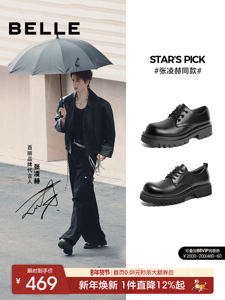 Zhang Linghe's Same Style Belle Men's Shoes, New Winter Thick-Soled Height-Increasing Leather Shoes, Large-Toe Casual Derby Shoes A1434Am4