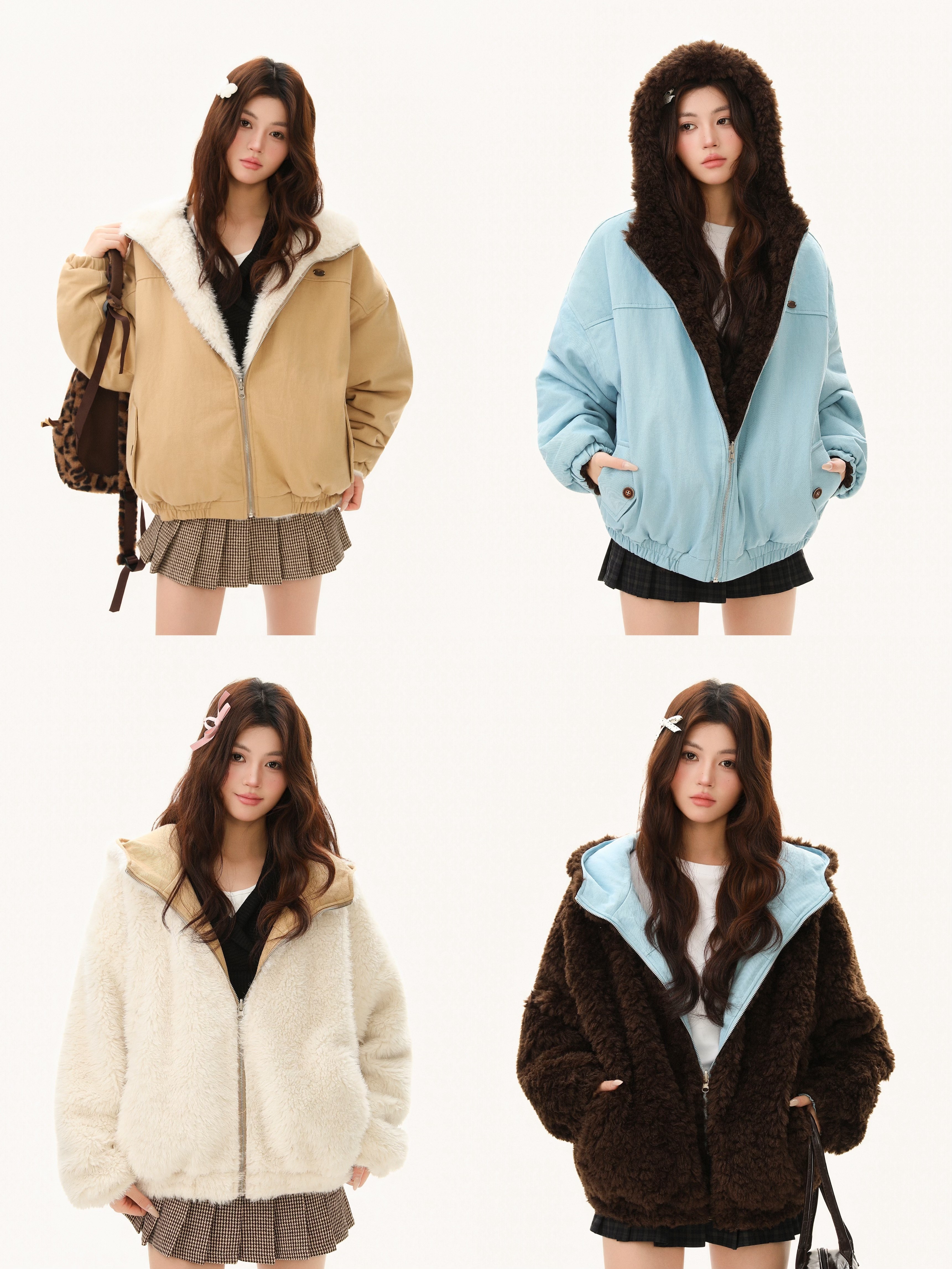 Lamblike Reversible Plush Hooded Jacket Autumn and Winter Korean Style Retro Warm Solid Color Thickened Cotton Coat for Women