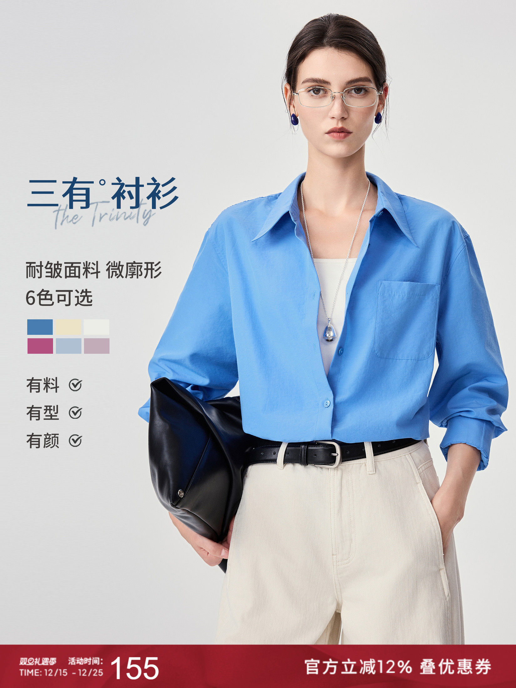 Cotton French-Style Pointed Collar High-End Blue Long-Sleeved Shirt for Women in Winter, Slightly Loose, Layered Casual Shirt That Is Not Easy to Wrinkle