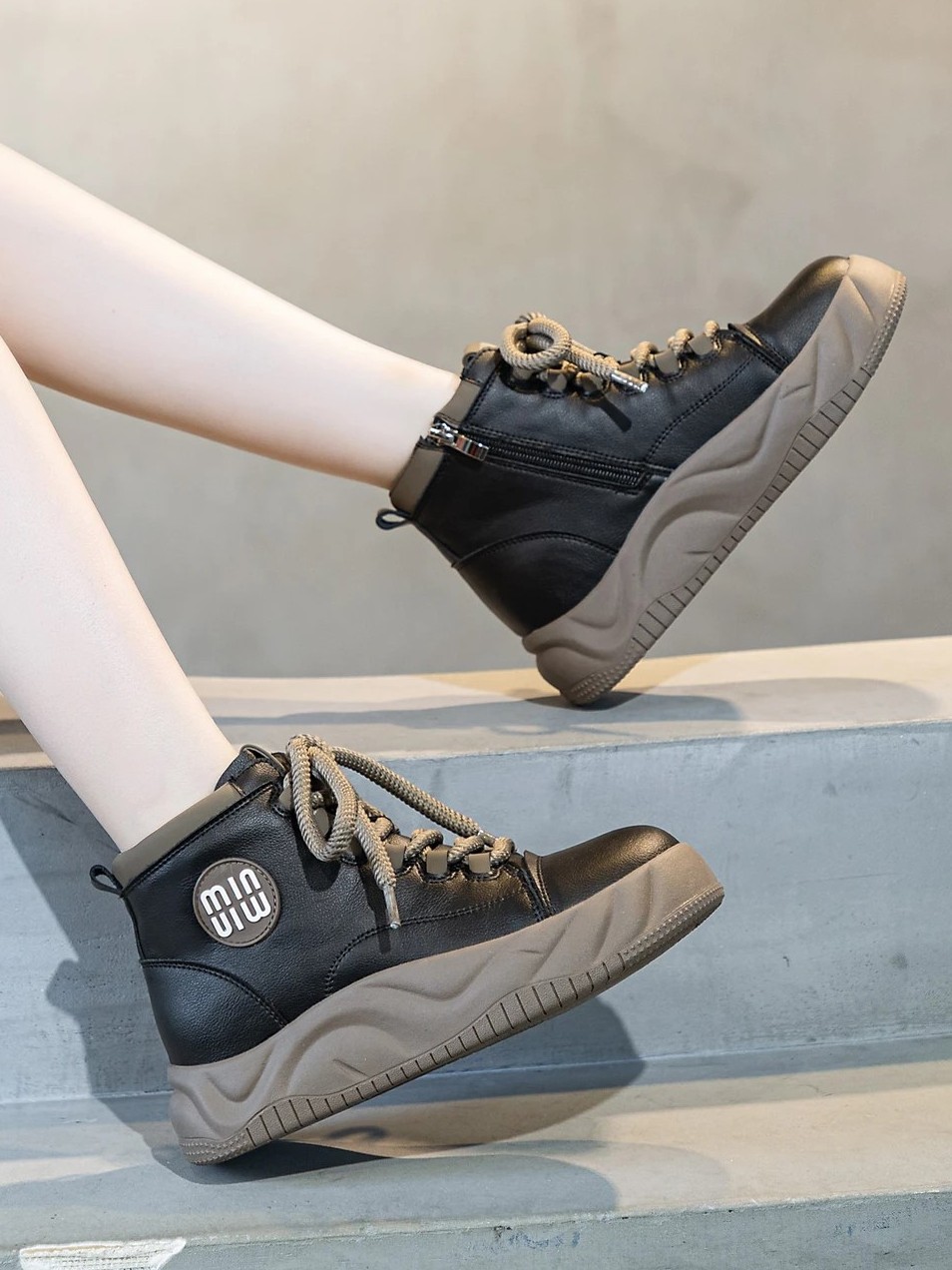 Genuine Leather Martin Boots for Women 2025 New Autumn and Winter Versatile Fleece-Lined High-Top Bread-Style Cotton Shoes Thick-Soled Height-Increasing Short Boots