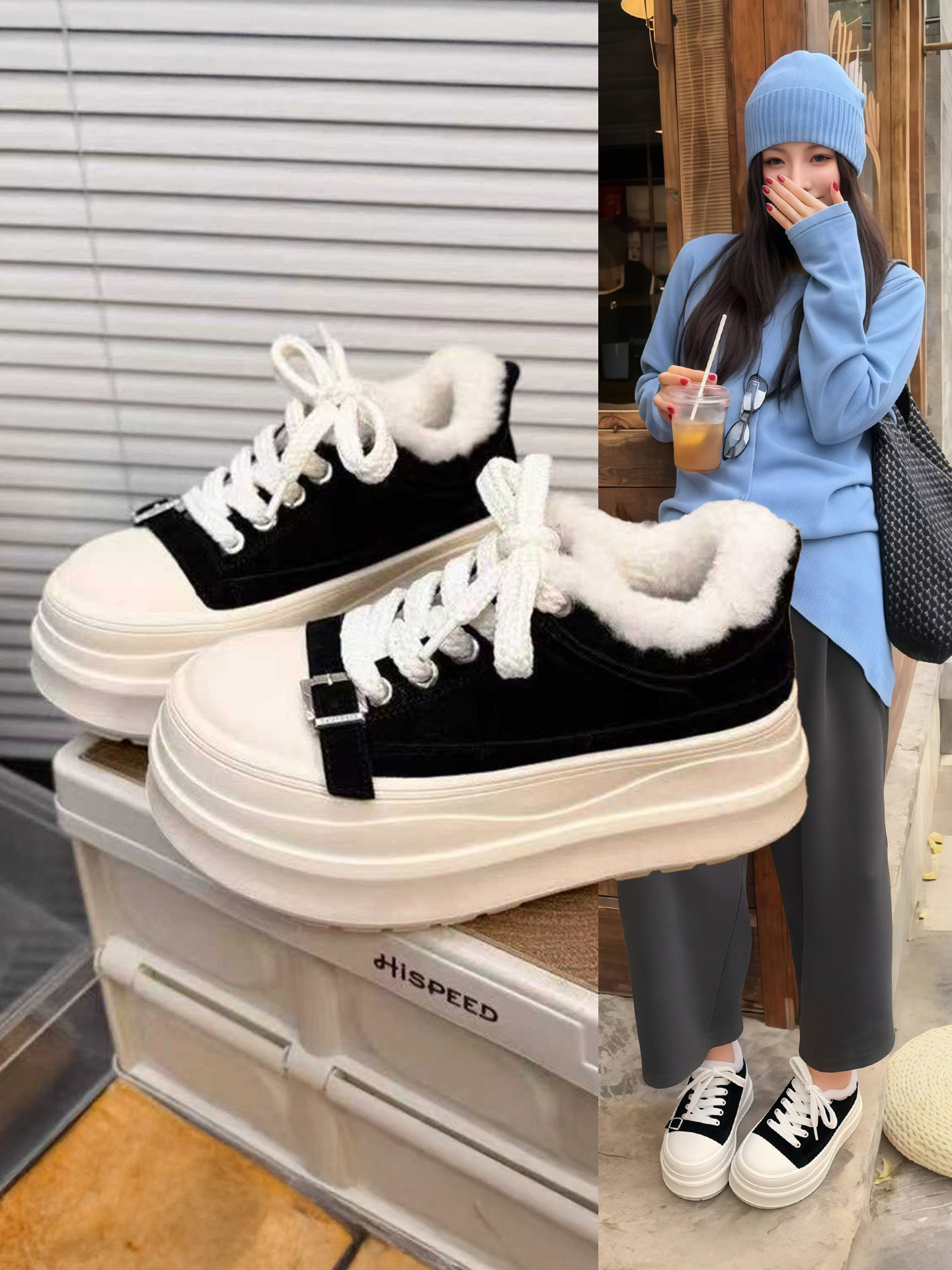 Hong Kong Retro Lamb Wool Thick-Soled Height-Increasing Sneakers for Women, Winter Genuine Leather Fleece-Lined Casual Warm Cotton Shoes, Versatile Furry Shoes