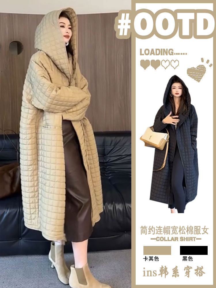 European Style Plus-Size Hooded Long Thin Cotton Coat for Women, Winter 2025 New Diamond-Patterned Quilted Jacket, Casual Overcoat