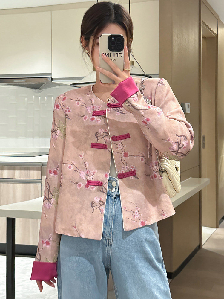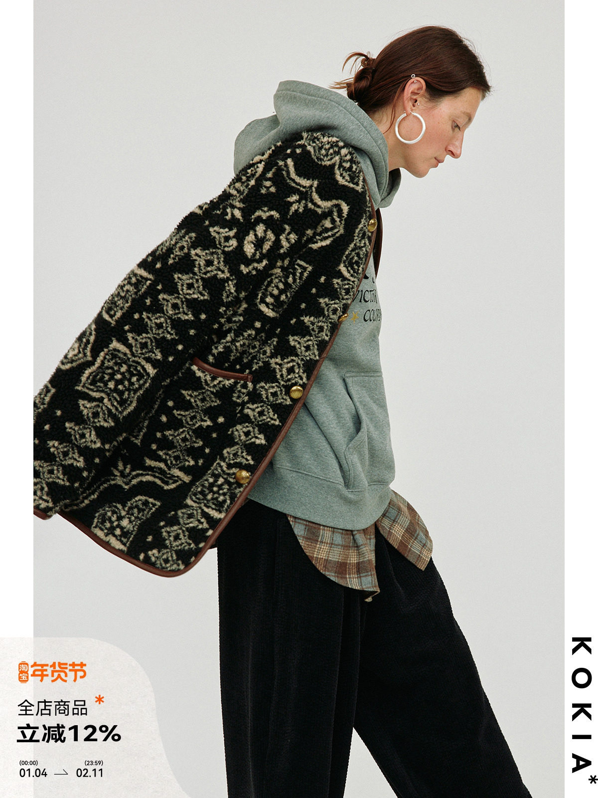 Kokia in Stock Retro Bandana Pattern High Warmth Fleece Vintage-Style Collarless Leather-Trimmed Jacket