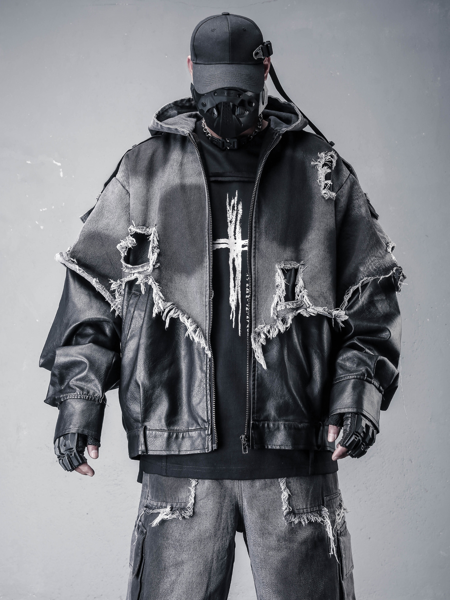 Wasteland-Style Distressed Whiskered Edge Patchwork Pu Denim Jacket Heavy-Duty Functional Street Punk Hip-Hop Hooded Coat