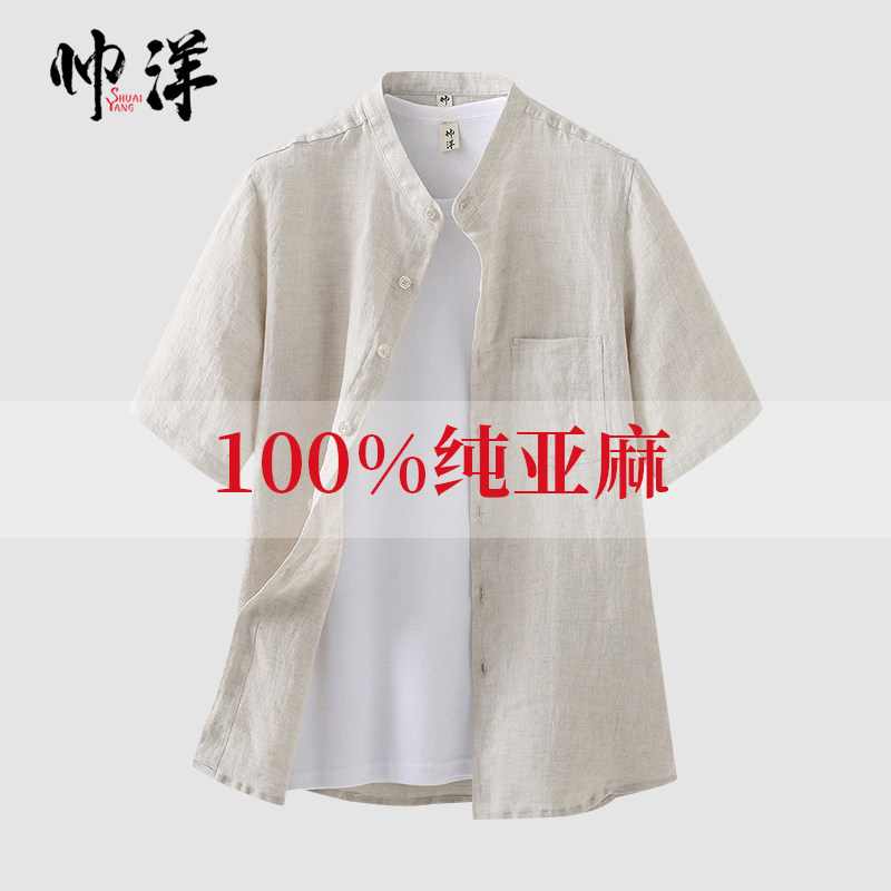 100% Linen Men's Short-Sleeved Shirt Summer 14-Count Pure Linen Retro Casual Thin Shirt Chinese Style Solid Color Half-Sleeve