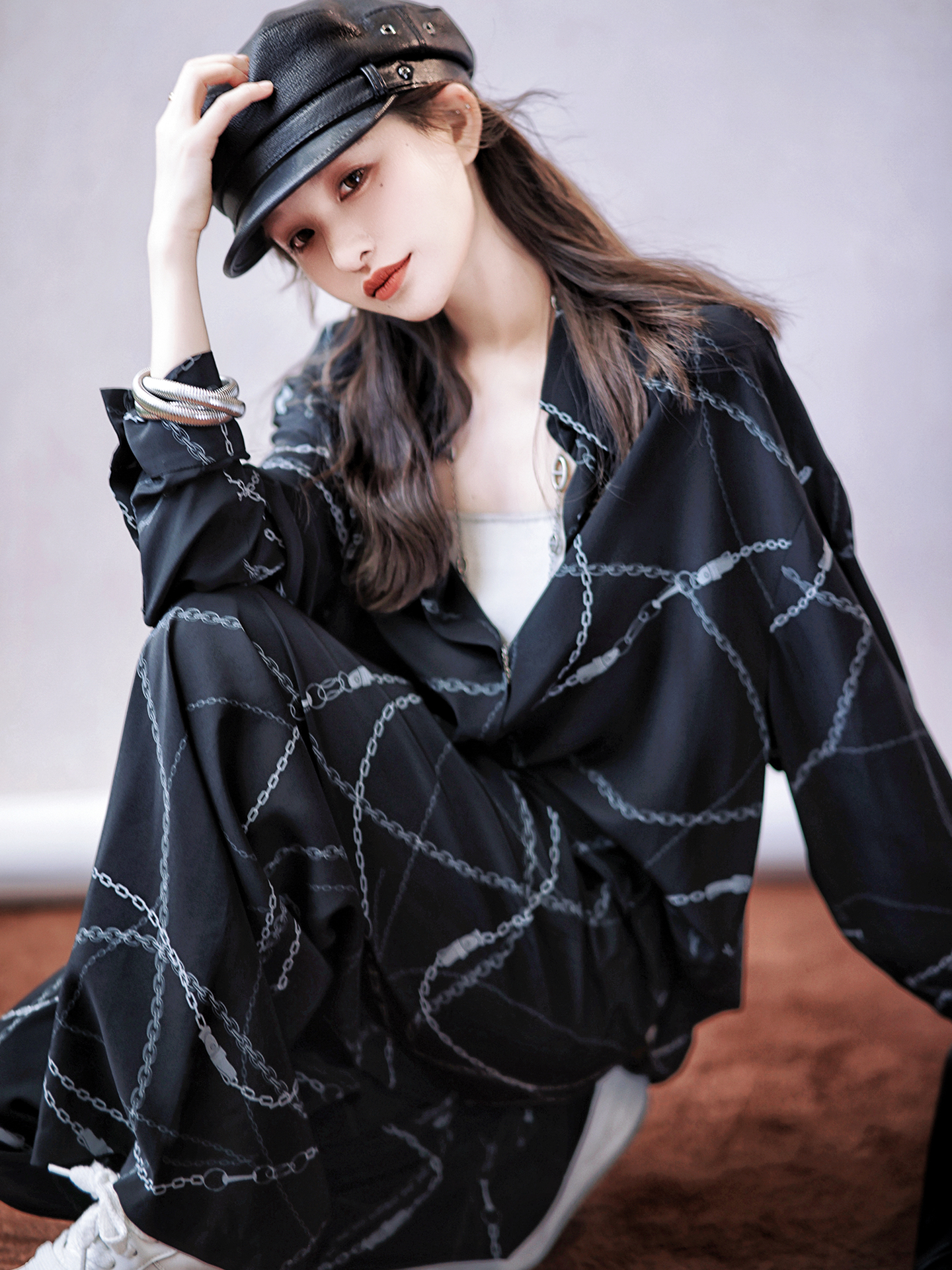 Zhao Daxi [in Stock] Old Money Silk Suit | Loose and Slimming Women's 100% Silk Chain Shirt + Wide-Leg Pants