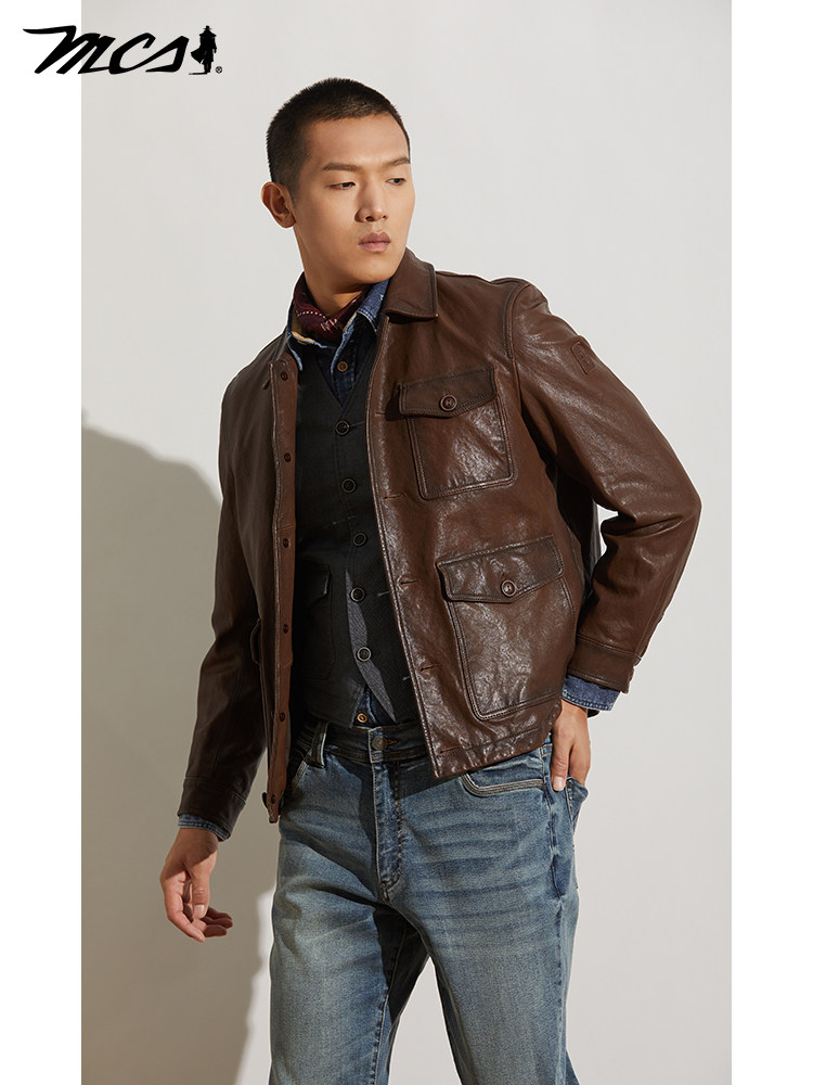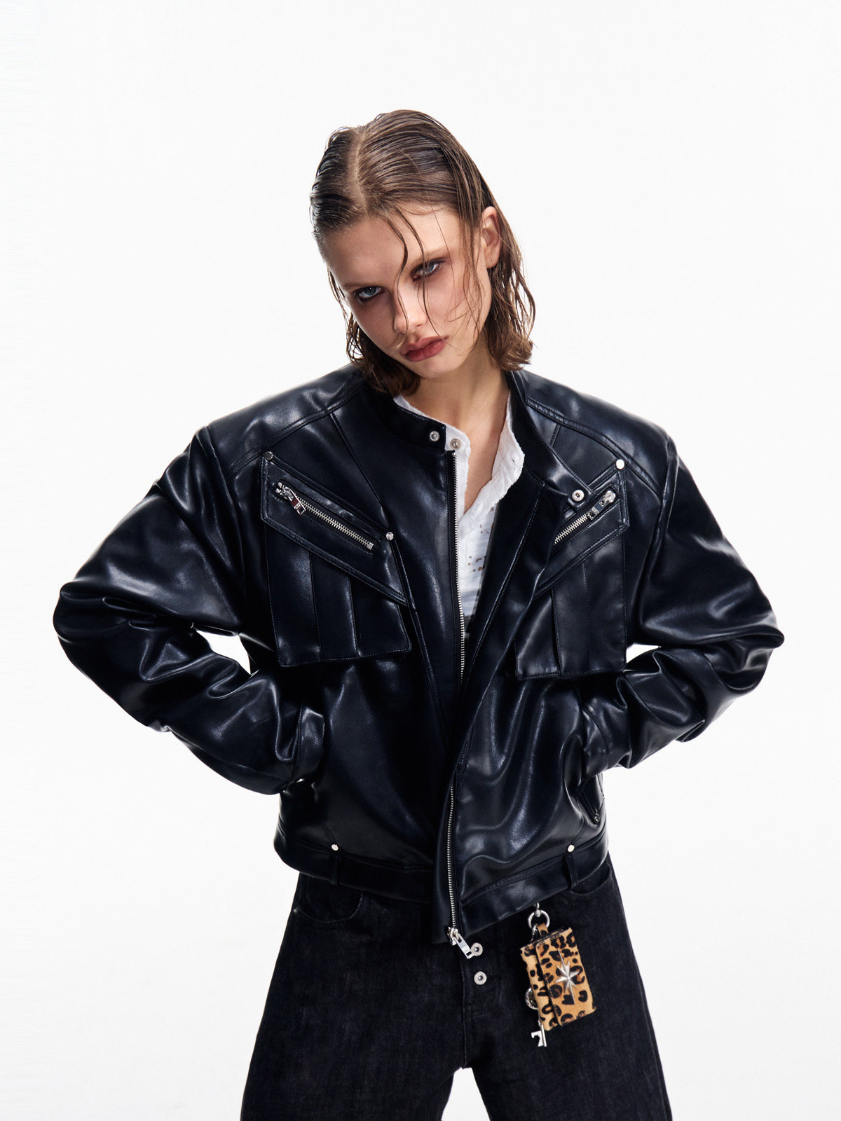 Peoplestyle Metal Zipper Short Biker Jacket Stand Collar High-End Silhouette Spring and Autumn Niche Leather Jacket