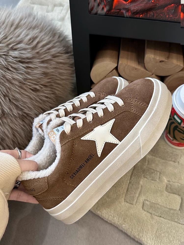 Hong Kong Genuine Leather Lamb Wool Star Shoes for Women 2025 New Winter Fleece-Lined Sports Casual Shoes Round Toe Lace-Up Sneakers