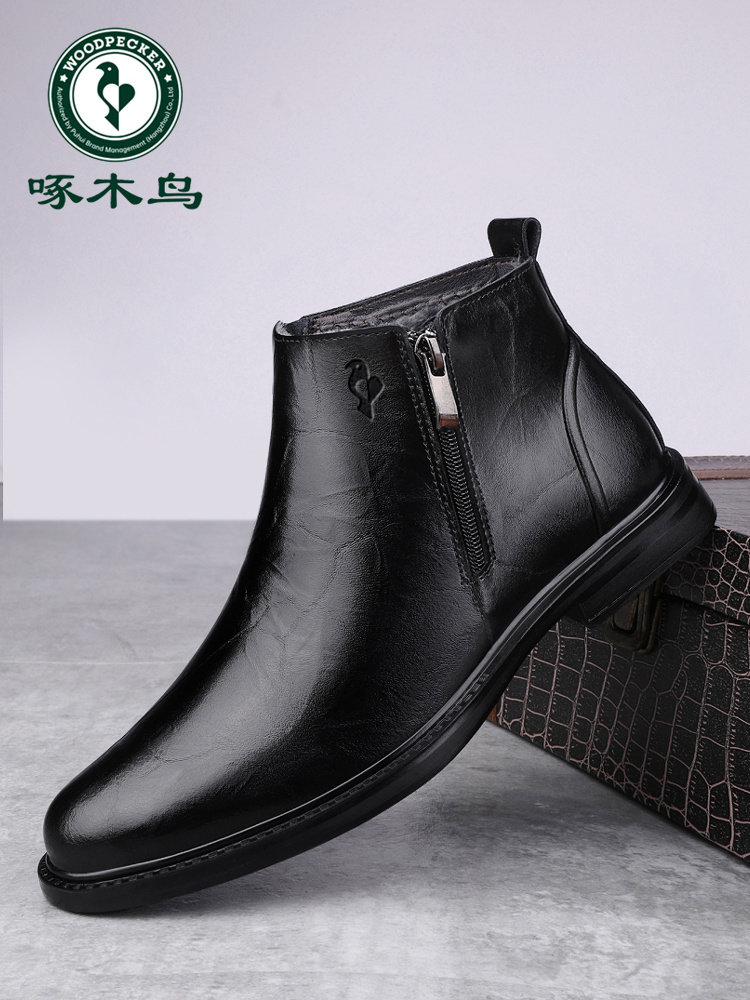 Woodpecker Men's Shoes Genuine Leather Soft Surface Soft Sole Winter Fleece-Lined Warm Cotton Boots Side Zipper Chelsea Boots High-Top Leather Shoes