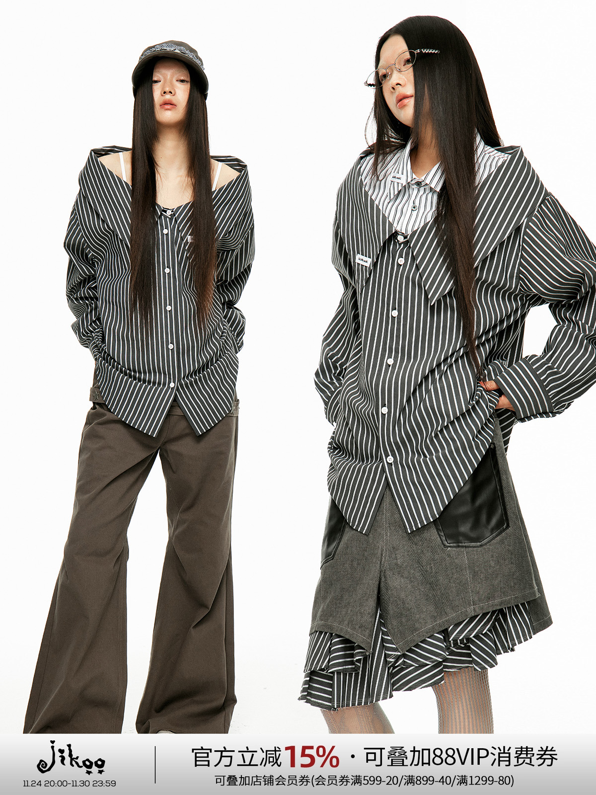 Jikoo【Black Rum】Design-Inspired Detachable Patchwork Vertical Striped Sexy Off-Shoulder Two-Way Casual Shirt for Women