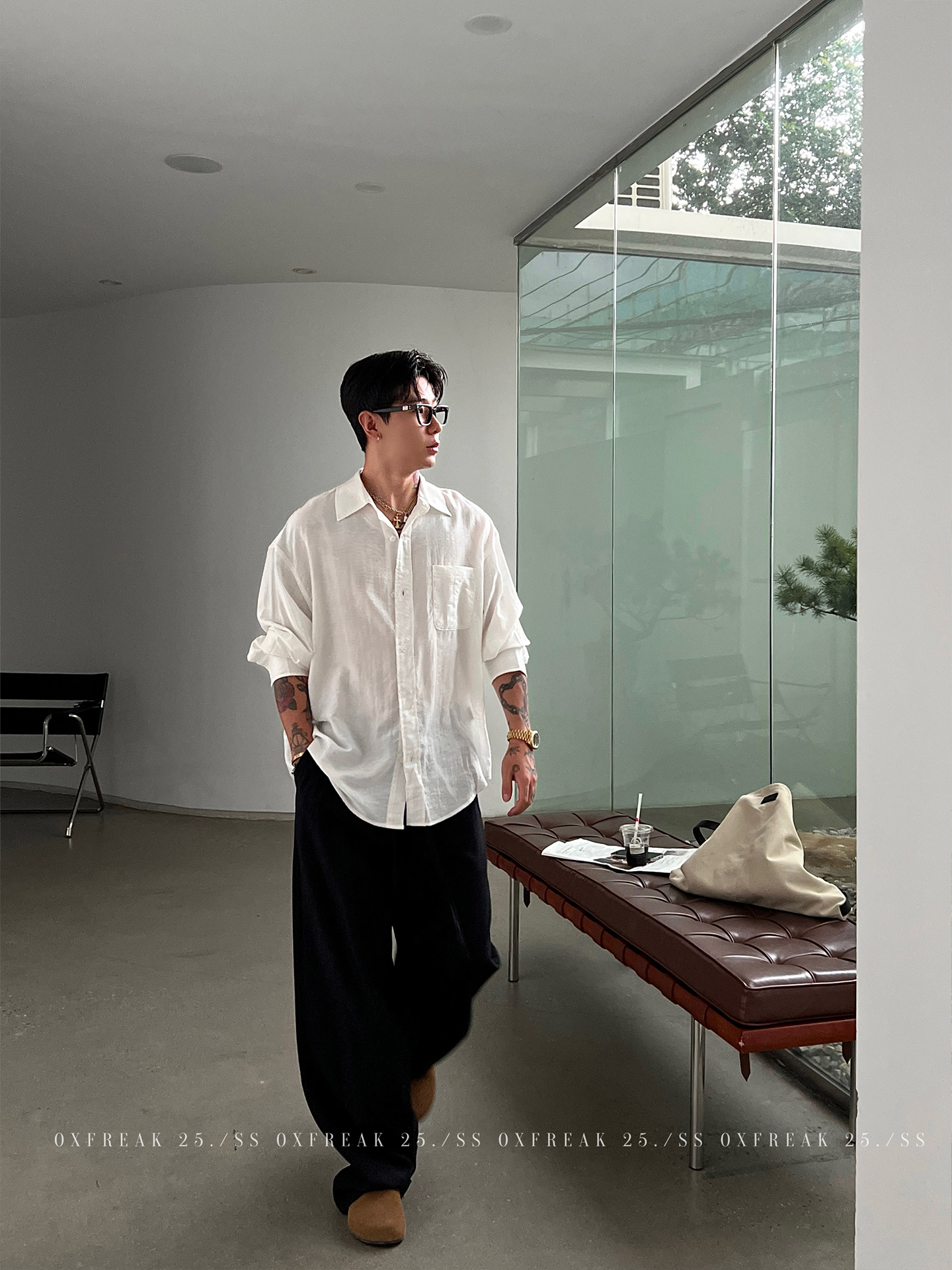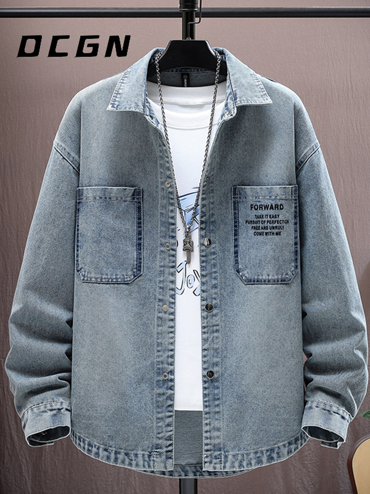 Ocgn Spring and Autumn Denim Jacket for Men, Trendy Brand, Loose Fit, Vintage Washed, Pocket Jacket, Long-Sleeve Shirt for Teenagers
