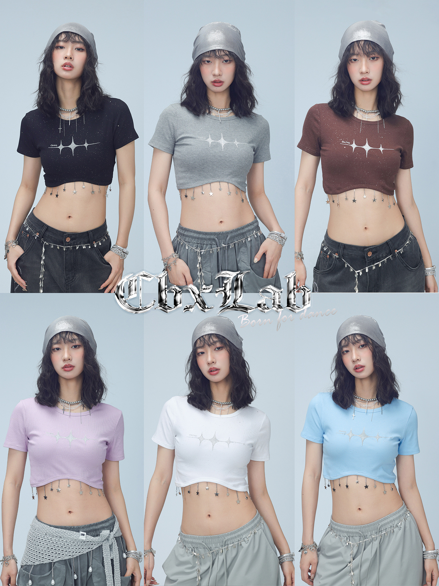 Cbxlab Street Dance Trendy Brand Summer Wave Crop Top Embroidered Short-Sleeve Star Chain Kpop Spicy Girl Slim Fit Top for Women