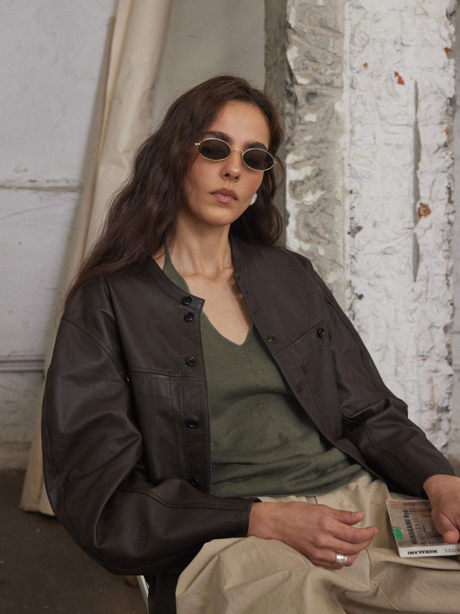 Madeinam British Imported First-Layer Calfskin Simple Retro Scimitar Sleeve Design Round Neck Short Leather Jacket