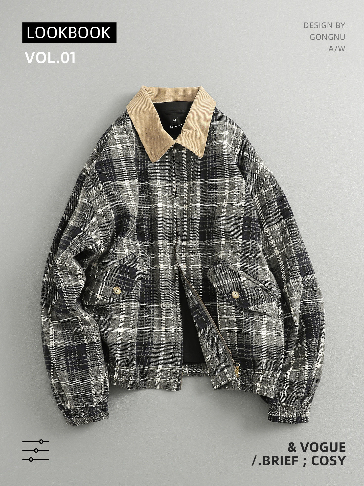 Autumn Japanese Casual Trendy Retro Loose Plaid Patchwork Corduroy Lapel Jacket for Men