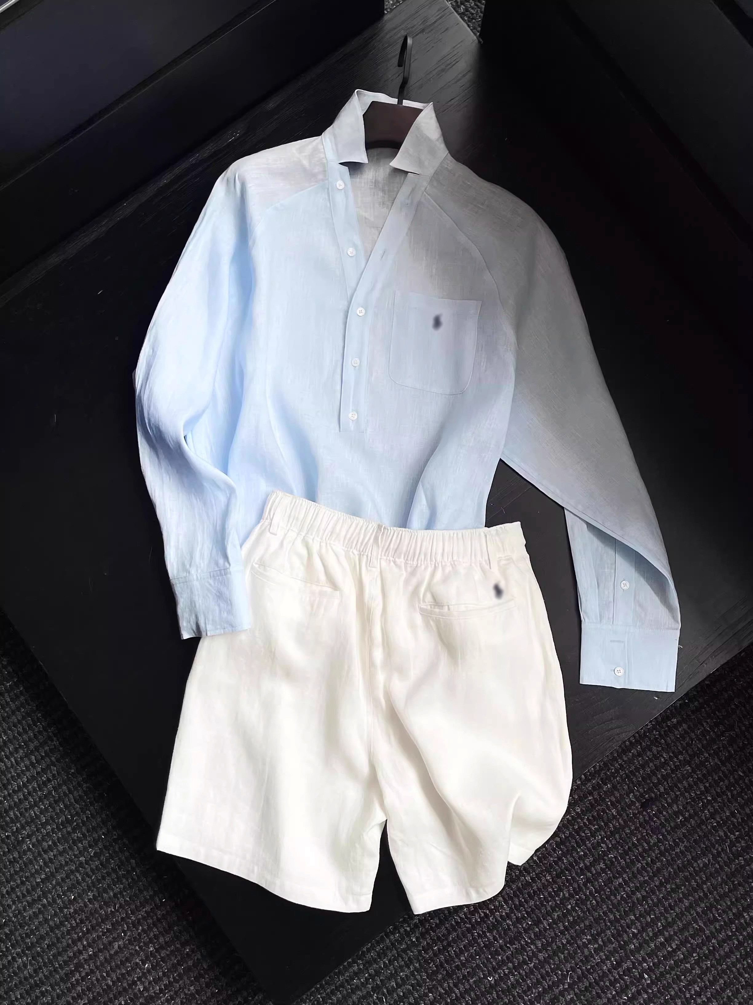 Old Money Style Sky Blue V-Neck Linen Shirt and Shorts Set for Men, Relaxed Fit Outfit, Long-Sleeved Shirt Complete Set