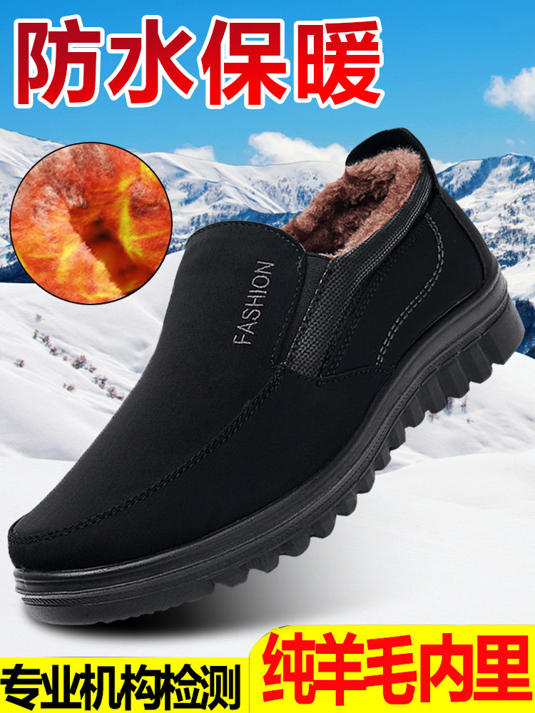 Winter Waterproof Elderly Cotton Shoes for Men, Fleece-Lined Warm Old Beijing Cloth Shoes for Men, Elderly Dad's Cotton Shoes, Non-Slip Shoes for the Elderly