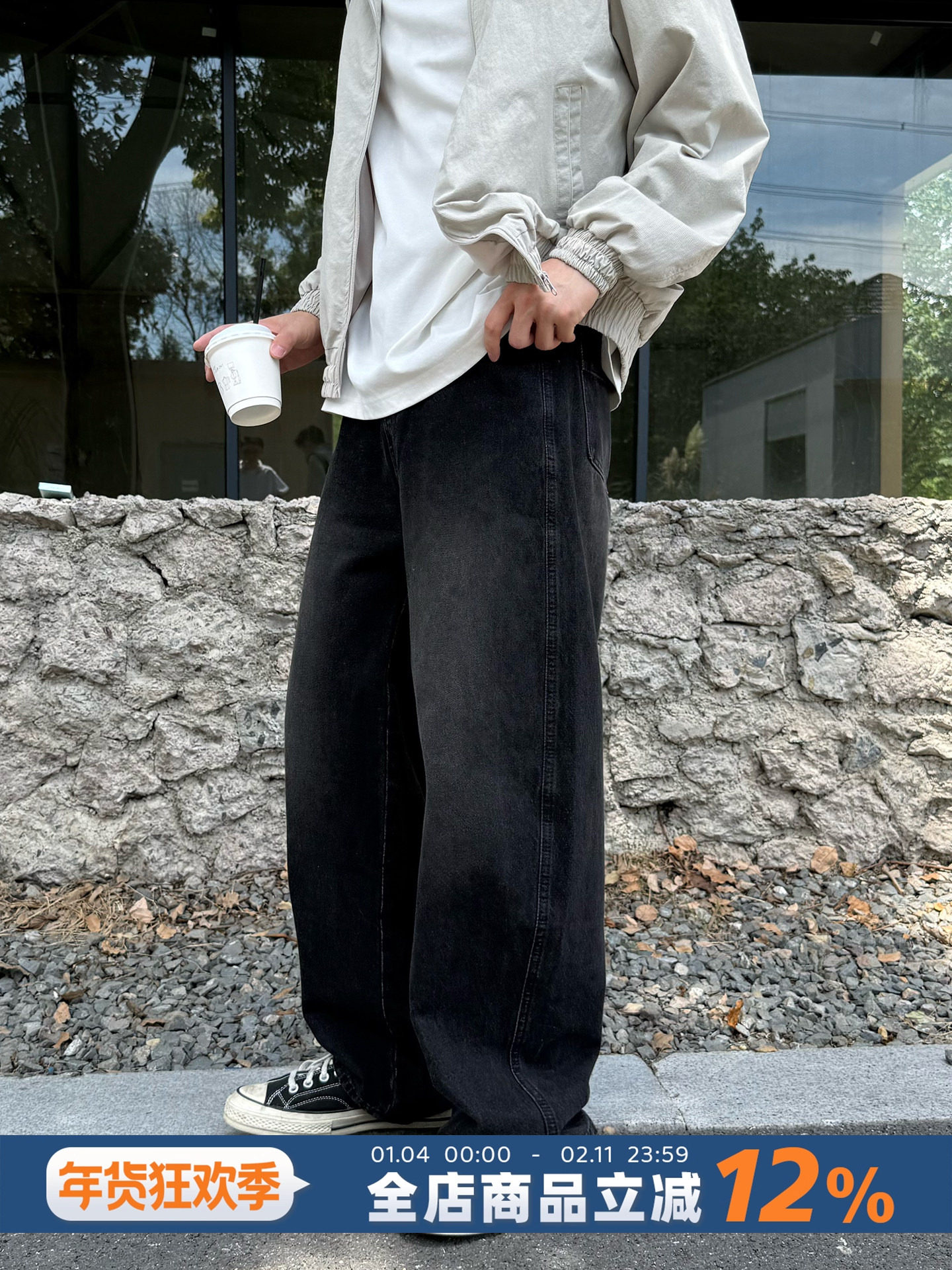 Black Vintage Washed Japanese-Style Scimitar Jeans for Men, New Spring Casual Loose Versatile Wide-Leg Long Pants
