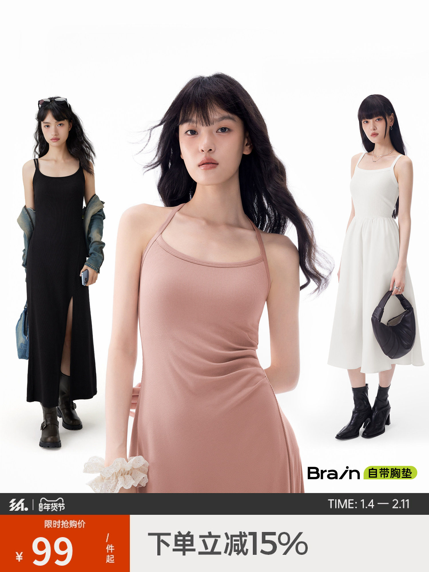 【Same Style as Papi】Semi-Sheer Camisole Dress with Chest Pads, Pure and Alluring Halter Neck Dress, Black Dress, Pink Long Dress