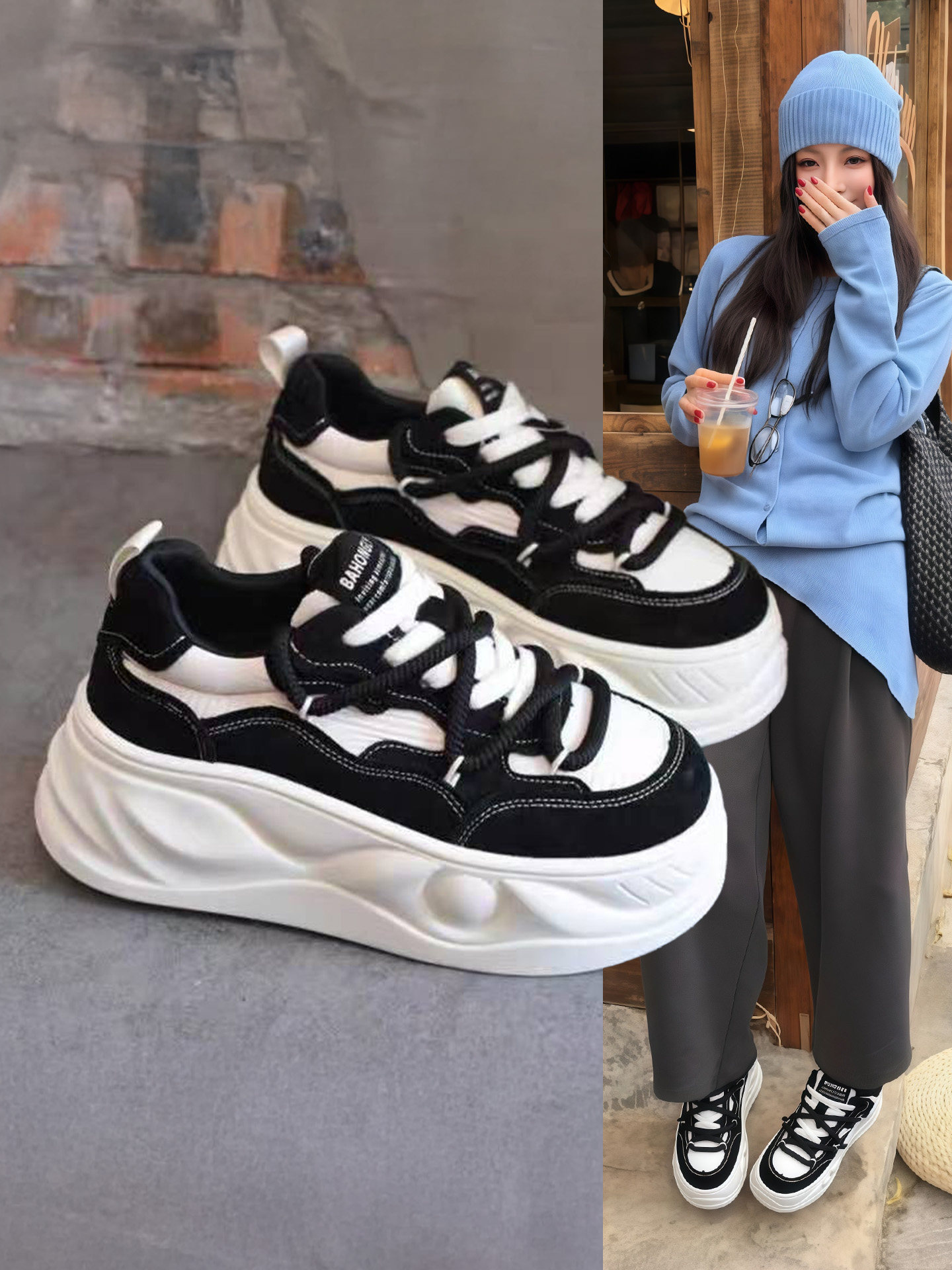 Hong Kong Style Platform Shoes for Women, Versatile Genuine Leather Platform Shoes, Popular White Shoes, Thick-Soled Height-Increasing Casual Sneakers