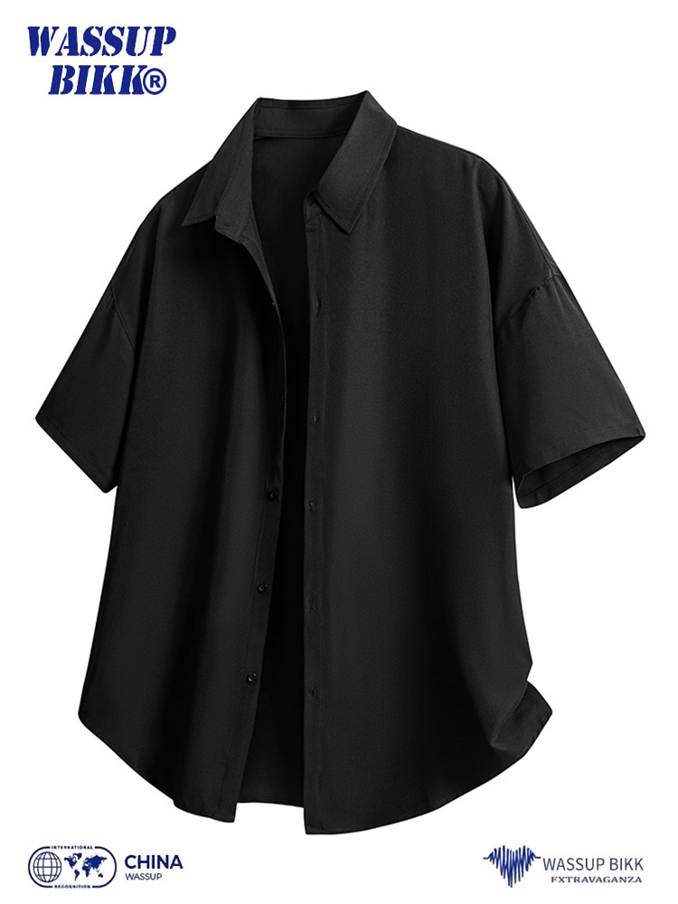 Wassup Bikk Drapey Ice Silk Black Short-Sleeved Shirt Men's Summer Pure Color Loose Half-Sleeved Shirt Jacket