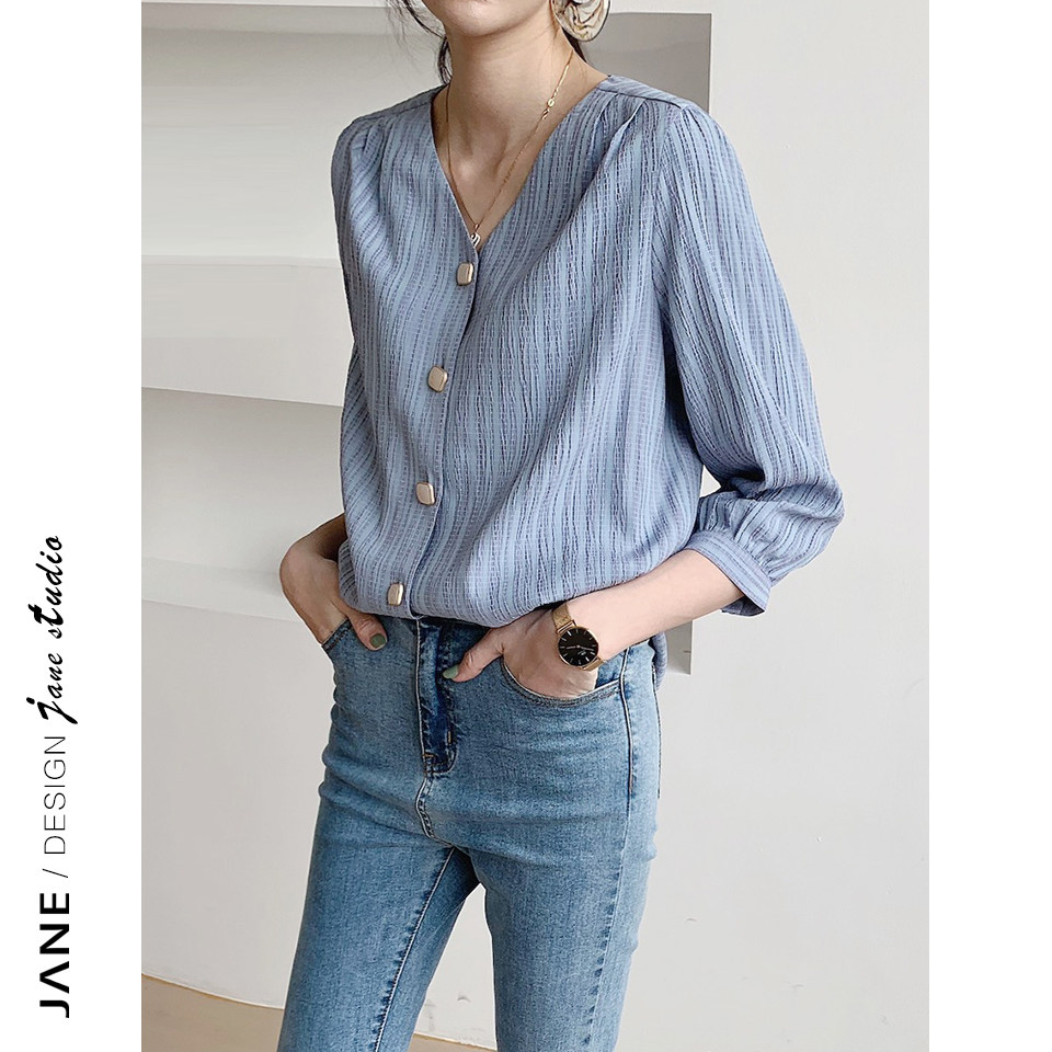 Jane Blue Three-Dimensional Striped Mid-Length Shirt for Women, French Retro Top with a Unique Design, Niche and Mature Style for Summer Wear