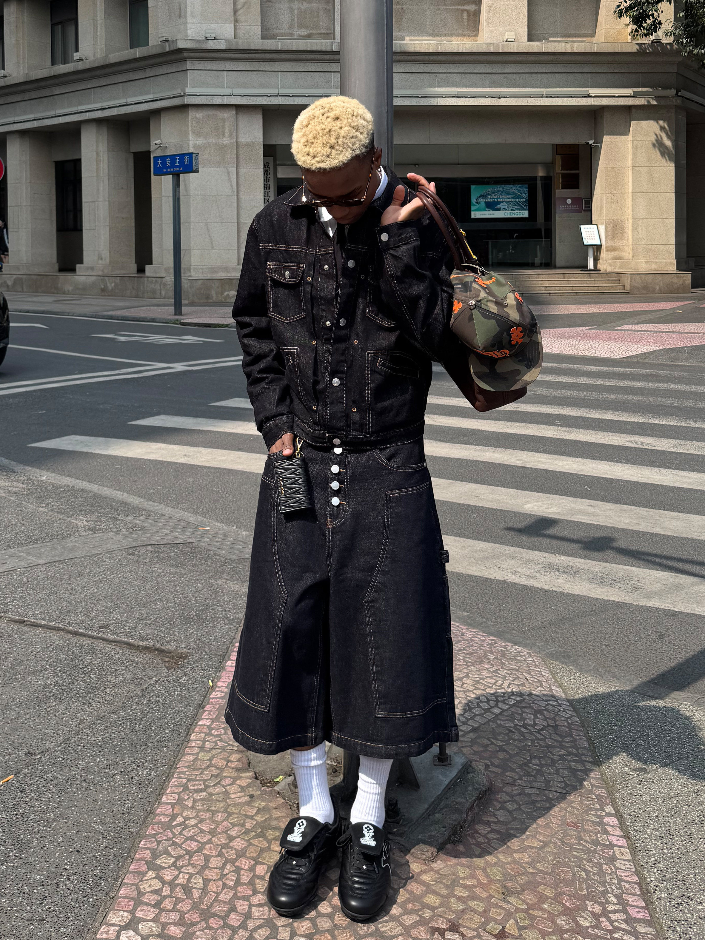 Steepc High-Waisted Stitched *Paris Buckle Lumberjack Denim Raw Cowhide Pre-Washed Workwear Capri Shorts Mid-Length Pants