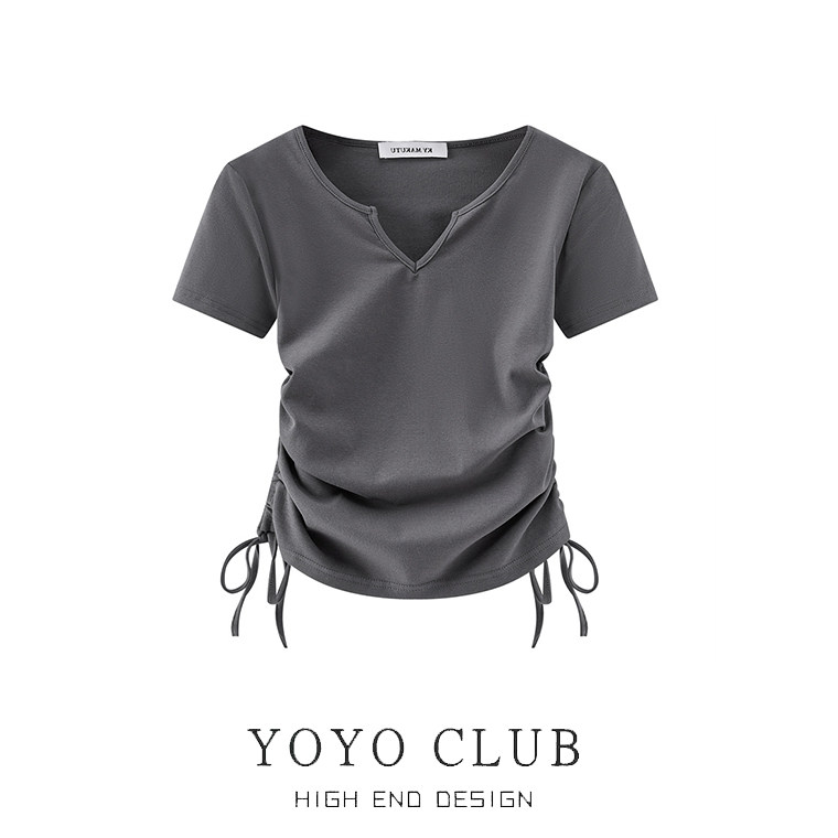 Brand Clearance Discount Summer Plus Size Regular Shoulder V-Neck Short-Sleeve T-Shirt for Women, Slimming Design with Irregular Drawstring Top