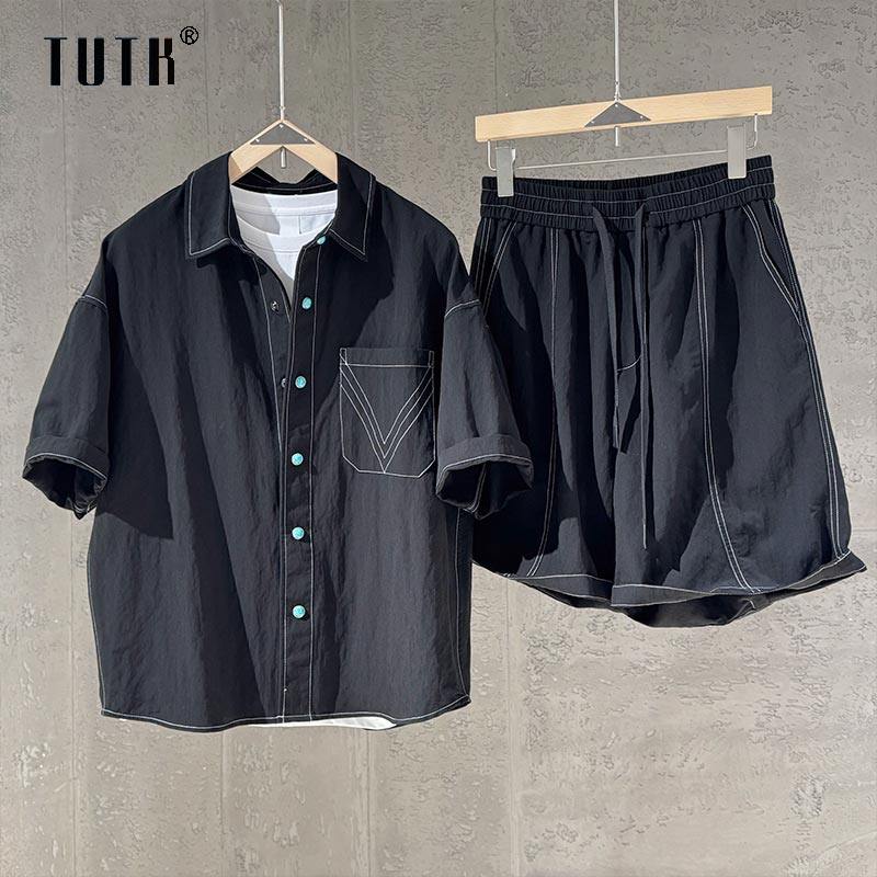 Casual Suit for Men, Summer Thin Style, Fashionable and High-End, Patchwork Lapel Workwear Short-Sleeved Shirt and Shorts Two-Piece Set