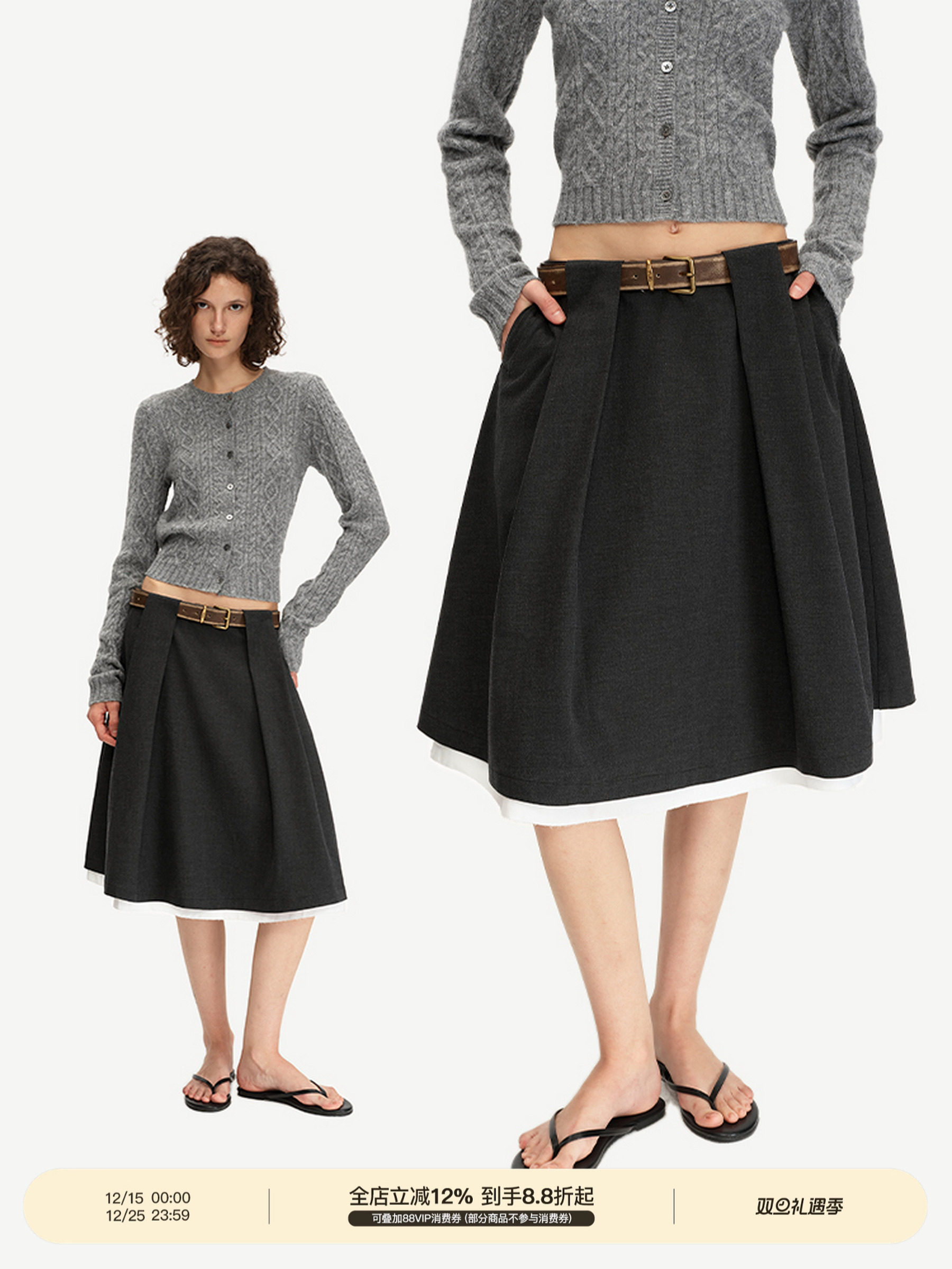 Puki Special Waistband Design, Retro High-Waisted Color-Blocked A-Line Versatile Umbrella Skirt Long Skirt