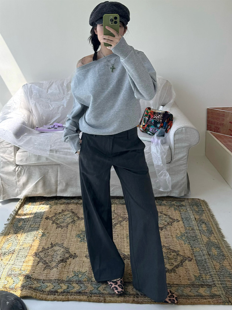 Spenpack// Anti-Wrinkle Drape Fabric Minimalist and Neat Dark Gray Suit with Slightly Flared Wide-Leg Trousers
